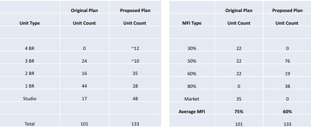 ✔ Affordability update: The original plan included 66 affordable units (at 30%, 50%, and 60% MFI) plus 35 market-rate units, averaging roughly 75% MFI overall.